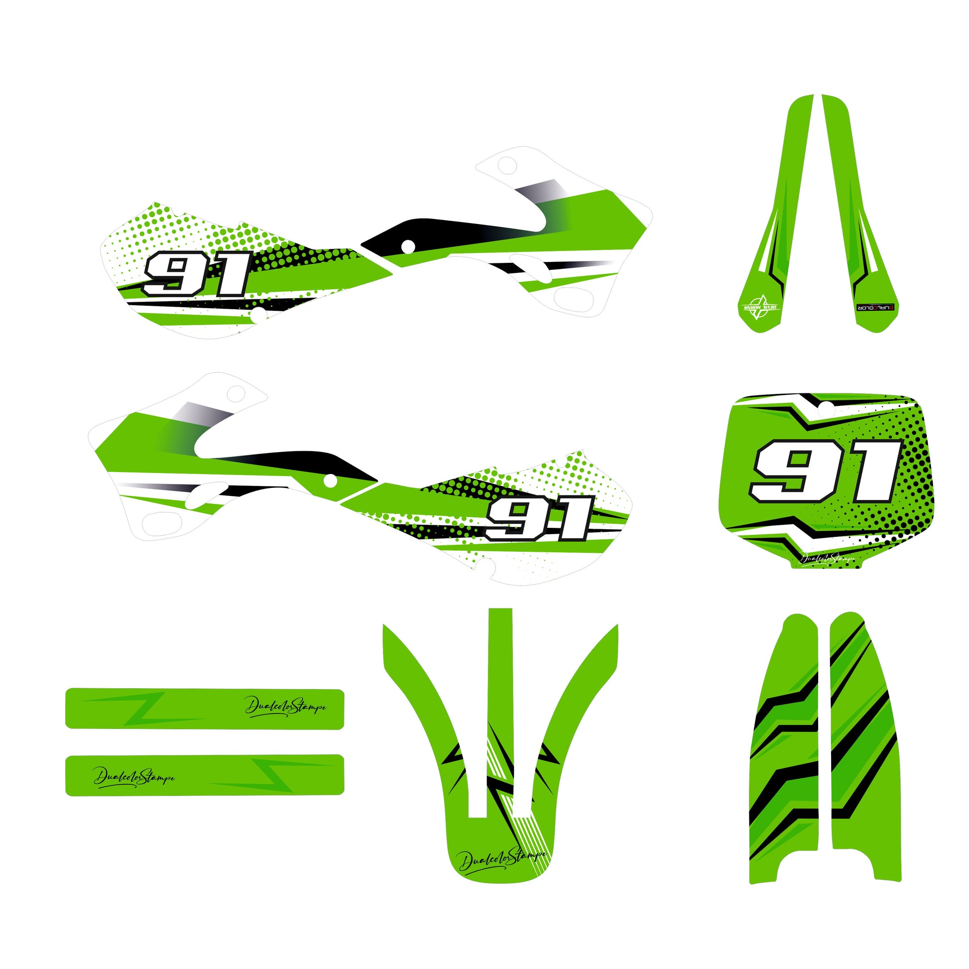 - Design Sportivo: Grafica verde acceso con numero 91, effetti halftone e dettagli neri e bianchi che conferiscono un look racing professionale e aggressivo alla tua moto da motocross